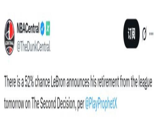 北京时间10月7日,勒布朗-詹姆斯突然更新社媒写道:“所有决定中的决定,10月7日,美东中午12点(北京时间10月8日凌晨0点)”。对此,美国顶级体育预测市场ProphetX认为,詹姆斯明天宣布退役消息的概率为52%。知名美媒CBS分析了詹姆斯的这一预告,质疑湖人超巨多次借“退役”炒作,真正决定时恐怕没人相信了。以下是CBS的解析——