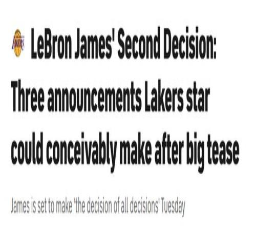 如果耗费这么多宣传资源,还特意复刻当年《决定》的风格,最终只是为了宣布一项新的合作代言,难免有些可惜。试想一下,詹姆斯说“我将把我的天赋带到[某体育博彩/饮料/食品公司]”,该有多令人失望。但遗憾的是,明天公布的消息很可能就是这样。如果真是如此,那策划者确实厉害——毕竟,他们成功让我、数百名体育记者以及数百万球迷,都在绞尽脑汁猜测公告内容。