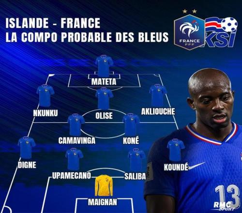 北京时间10月13日,RMC体育预测了世预赛法国客战冰岛的首发名单,德尚被认为会进行大幅度的轮换,马特塔和阿克利乌什有望迎来各自在法国国家队的首次首发。