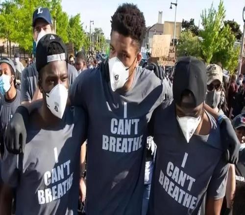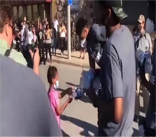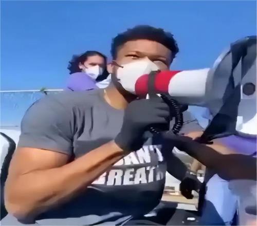 除了现场喊话表示支持之外,字母哥还跟队友们一起穿上了“我不能呼吸”的T恤,同时买了很多物资。 字母哥更是亲自弯腰给这些参与者发放矿泉水。