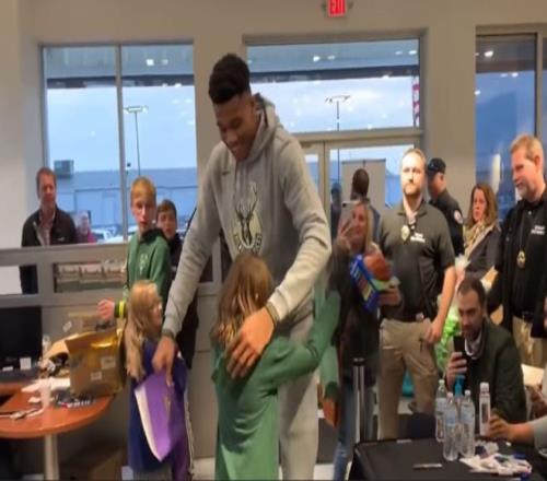 在雄鹿的一场签名会现场,一个小女孩将球衣递给了字母哥,随后将自己亲手画的画册送给了自己的偶像,字母哥也是立马起身拥抱了小女孩,还一页一页的看了小女孩的画册。 看到小女孩激动落泪后,字母哥也是赶紧去安抚女孩的心情,还与小女孩一起合影留念。