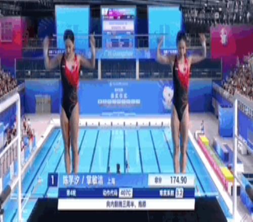 第三跳107b动作上,陈芋汐和掌敏洁仍然保持着同步率惊人的出色发挥,以174.9分领先第二名近10分继续领跑。