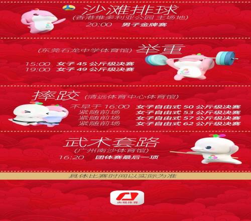 十五运会11月9日晚正式开幕 今天(10日) 各项比赛 将继续在广东、香港、澳门展开 精彩赛事不容错过! 游泳比赛今天迎来首个金牌日 跳水赛场继续上演“神仙打架” 更有多名乒乓球名将亮相 游泳 男子400米自由泳决赛 19:00 女子400米自由泳决赛 19:31 女子4×100米自由泳接力决赛 20:18 男子4×100米自由泳接力决赛 20:27