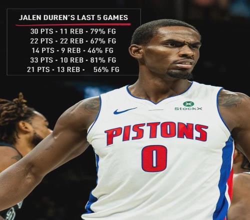 这个榜单的前三名是霍华德(169)、唐斯(124)和德拉蒙德(114)。杜伦出生于2003年11月18日,距离22岁只剩8天。未来8天活塞正好有4场比赛,他有望追平庄神。杜伦目前还是4年1947万美元的新秀合同,明年夏天到期。
