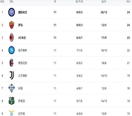 这一轮比赛全部踢完,积分榜易主,国际米兰8胜3负,拿到24分,登顶积分榜。罗马的战绩和国际米兰一模一样,也是24分。但是,罗马的净胜球只有7个,而国际米兰的净胜球有14个。因此,罗马只能屈居第2。AC米兰排名第3,拿到22分。输球的那不勒斯也是22分,排名第4。博洛尼亚则升到了第5名,把尤文图斯挤了下去。尤文图斯只拿到19个积分。 |