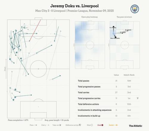 多库成为曼城在阿提哈德球场3-0战利物浦的明星球员,但这场胜利并非没有争议。 哈兰德在一次精彩的团队配合后头球破门首开纪录(此前他罚失了一粒点球),尼科-冈萨雷斯通过折射球扩大比分,多库则以一记精彩的个人表演打入第三球,为本场出色表现画上句号。然而,范戴克的一记头球“破门”本可在上半场尾声将比分扳为1-1,却因罗伯逊被颇具争议地判定处于越位位置而被取消,VAR复核后并未推翻场上的初始判罚。 此役结果使得曼城在十一月份国际比赛日来临之际位居积分榜次席,落后领头羊阿森纳4分,而利物浦则排名第八,落后曼城4分。 英超观赏性回归? 关于本赛季英超比赛质量的抱怨一直很多——其中很多是合理的。大量的界外球和定位球,缺乏盘带和渗透性传球配合,意味着在总共38个比赛日中的前11轮,这是一个充满消耗战的赛季。