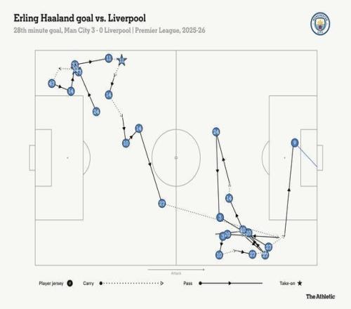 但这场比赛有所不同:技术型足球,地面传递,节奏良好且并非只是为了跑动而跑动。压迫战术并非今天曼彻斯特东部战场的主旋律。 曼城专注于让球员插入肋部空当,然后从后防线发起渗透性传球。他们的边路球员多库和谢尔基可以自由内切或保持宽度。与此同时,利物浦在中场布置了三名“正宗”中场以增强中路硬度,这也使得夏窗1亿英镑签下的维尔茨影响力日益增强,他经常从左路内切并找到空当。上半场他就让两名对手吃到黄牌,曼城球员似乎对他的带球突破颇为忌惮。 哈兰德的头球首开纪录是一次传统的边路传中加头球攻门,但它源自一次长时间、流畅的传球配合,这是我们本赛季很少见到的。这次配合涉及了曼城所有场上球员,展现了耐心、精准和些许个人才华。