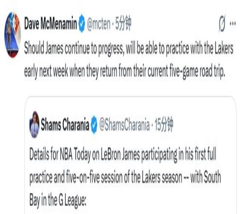 名记Shams在节目上报道了詹姆斯的最新情况。“詹姆斯已被下放到球队的NBA发展联盟附属球队南湾湖人队,并且完成了本赛季的首次NBA训练——最关键的是,这是他本赛季首次参与5对5对抗训练。” “他正从右侧坐骨神经痛的伤病中恢复,为赛季首秀做准备。今天下午有消息人士告知我,詹姆斯在训练中的状态非常出色,自己感觉良好。他移动灵活,应对右侧坐骨神经相关不适时,并未出现任何异常状况。目前据我了解,詹姆斯斗志昂扬,迫切希望重返赛场,湖人队方面正逐日对他进行评估,他有可能在本月晚些时候迎来复出。” Shams还表示,后续的关键在于他今晚和明天的身体反应,毕竟这是他首次经历高强度的5对5对抗。当然,在正式首秀前,他还需要完成更多训练来寻找状态,但此刻,勒布朗-詹姆斯开启了自己历史性第23个NBA赛季的复出与首秀进程。”