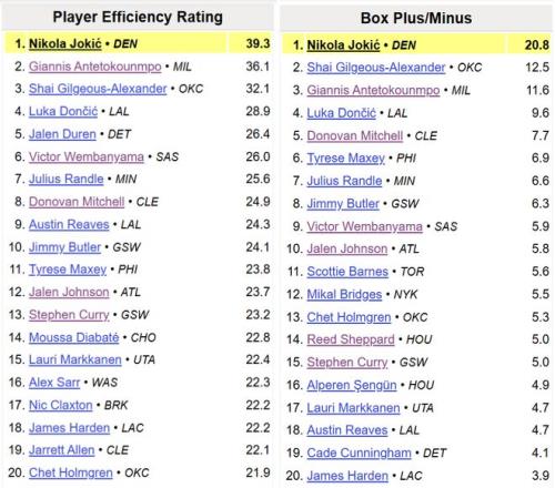 再看下最新的高阶数据: ——PER值,约基奇是39.3 ——BPM,约基奇是+20.8 两项都是联盟第一和历史第一,其中BPM直接断了两档,他和第二的亚历山大之间,甚至能再塞一个第五的米切尔。