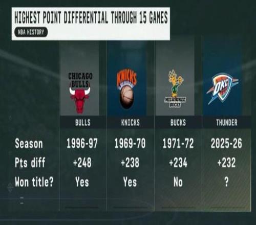 雷霆赛季前15场净胜232分排历史第四,前三仅一队未夺冠