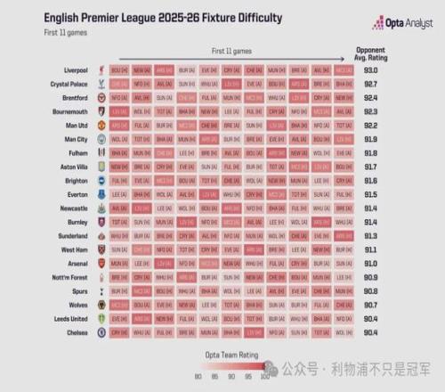 4、权威数据机构OPTA给出的统计表明: --本赛季英超已经进行的前11轮比赛,利物浦的赛程难度最大,高居英超第一。阿森纳的赛程难度只排到第15,也就是第六容易。