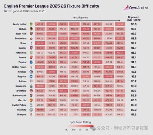 而未来8轮英超赛程,利物浦的难度从正数第一骤变倒数第一,也就是最容易,而阿森纳的难度排在第8。