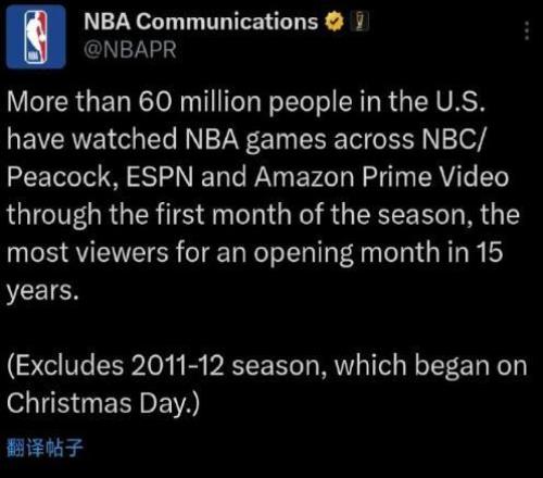 11月21日,NBA官方消息,常规赛至今一个月,全美直播观看NBA的观众超6000万人次,刷新NBA15年以来的新纪录!