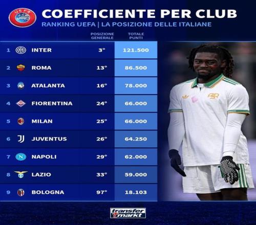 1. 国际米兰 121.500分(全欧第3) 2. 罗马 86.500分(全欧第13) 3. 亚特兰大 78.000分(全欧第16) 4. 佛罗伦萨 66.000分(全欧第24) 5. AC米兰 66.000分(全欧第25) 6. 尤文图斯 64.250分(全欧第26) 7. 那不勒斯 62.000分(全欧第29) 8. 拉齐奥 59.000分(全欧第33) 9. 博洛尼亚 18.103分(全欧第97) |