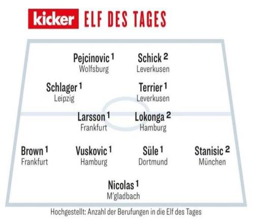 前锋:佩契诺维奇(沃尔夫斯堡)、希克(勒沃库森) 中场:施拉格尔(莱比锡)、胡戈-拉松(法兰克福)、洛孔加(汉堡)、泰里耶(勒沃库森) 后卫:纳撒尼尔-布朗(法兰克福)、卢卡-武什科维奇(汉堡)、聚勒(多特)、斯塔尼希奇(拜仁) 门将:莫里茨-尼古拉斯(门兴) |