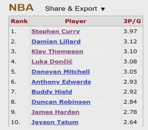 目前,克尼普尔的场均三分球命中数排在NBA历史第2位,只不过他还太年轻,他的出场数以及命中数还未达标,所以没进入统计榜单。 在NBA历史三分球场均命中数的榜单上,排名第1的是库里,他目前为止的职业生涯里出战1046场比赛,场均投进3.97个三分球,命中率是42.3%。