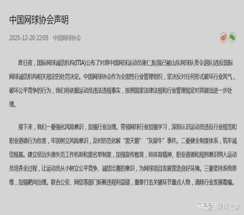 我们再来关注中国球员违规遭处罚事件。一天前,国际网球诚信机构(ITIA)确认,中国网球运动员逄仁龙因操纵或企图操纵比赛,被处以禁赛12年并罚款11万美元(其中7万美元暂缓执行)的处罚。随后,中国网球协会发声明,对这一事件表态。