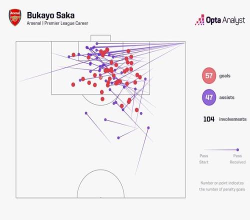 参与104球超越皮雷,萨卡升至阿森纳队史英超参与进球榜第七