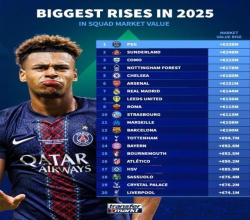 德转已经更新了各大联赛球员身价,并据此统计了在2025年的俱乐部身价涨幅情况,新科欧冠冠军巴黎领跑。2025俱乐部身价涨幅榜:欧元 1. 巴黎圣日耳曼,+3.38亿 2. 桑德兰,+2.48亿 3. 科莫,+2.23亿 4. 诺丁汉森林,+1.78亿 5. 切尔西,+1.6亿 6. 阿森纳,+1.51亿 7. 皇家马德里,+1.44亿 8. 利兹联,+1.36亿 9. 罗马,+1.15亿 10. 斯特拉斯堡,+1.13亿 11. 马赛,+1.08亿 12. 巴塞罗那,+1亿 13. 热刺,+9470万 14. 拜仁慕尼黑,+9260万 15. 伯恩茅斯,+9250万 16. 马德里竞技,+9020万 今日(12.28) 09:00 NBA常规赛 尼克斯 - 老鹰 09:00 NBA常规赛 步行者 - 热火 09:00 NBA常规赛 雄鹿 - 公牛 09:00 NBA常规赛 骑士 - 火箭 09:00 NBA常规赛 篮网 - 森林狼 09:00 NBA常规赛 爵士 - 马刺 10:00 世界网球洲际对抗赛 瓦舍罗 - 张之臻 11:00 乒超联赛总决赛男/女团决赛 11:00 NHL常规赛 埃德蒙顿油人 - 卡尔加里火焰 13:30 CBSA斯诺克苏州表演赛 赵心童 - 亨得利 15:30 澳女篮常规赛 珀斯山猫女篮 - 墨尔本袋鼠女篮 17:00 德杯八强赛 OMG - LNG 19:30 意甲第17轮 AC米兰 - 维罗纳 19:30 WCBA常规赛 广东女篮 - 河北女篮 19:30 CBSA斯诺克苏州表演赛 丁俊晖 - 傅家俊 19:35 CBA常规赛 宁波 - 天津 19:35 CBA常规赛 福建 - 北京 19:35 CBA常规赛 广州 - 吉林 19:35 CBA常规赛 同曦 - 江苏 19:35 CBA常规赛 青岛 - 山东 19:35 CBA常规赛 山西 - 广东 19:35 CBA常规赛 浙江 - 新疆 20:00 省港杯首回合 中国香港 - 广东 20:30 非洲杯小组赛F组第2轮 加蓬 - 莫桑比克 21:30 CBA潜力赛 同曦 - 江苏 21:30 CBA潜力赛 广州 - 吉林 21:30 CBA潜力赛 浙江 - 新疆 21:30 CBA潜力赛 宁波 - 天津 21:30 CBA潜力赛 青岛 - 山东 22:00 意甲第17轮 克雷莫内塞 - 那不勒斯 22:00 英超第18轮 桑德兰 - 利兹联 23:00 非洲杯小组赛E组第2轮 赤道几内亚 - 苏丹 23:45 网球性别大战 萨巴伦卡 - 克耶高斯 明晨(12.29) 00:30 英超第18轮 水晶宫 - 热刺 01:00 意甲第17轮 博洛尼亚 - 萨索洛 01:30 非洲杯小组赛E组第2轮 阿尔及利亚 - 布基纳法索 02:00 葡超第16轮 布拉加 - 本菲卡 03:45 意甲第17轮 亚特兰大 - 国际米兰 04:00 非洲杯小组赛F组第2轮 科特迪瓦 - 喀麦隆 04:30 葡超第16轮 葡萄牙体育 - 里奥阿维 04:30 NBA常规赛 勇士 - 猛龙 04:30 NBA常规赛 76人 - 雷霆 07:00 NBA常规赛 灰熊 - 奇才 07:00 NBA常规赛 凯尔特人 - 开拓者 |