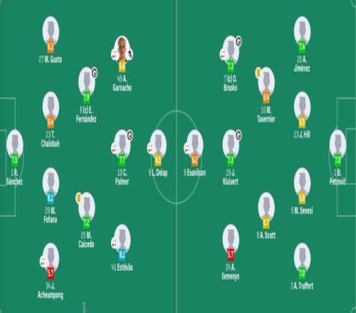 【出场阵容】 切尔西首发:1-桑切斯、34-乔什·阿昌庞(46'24-詹姆斯)、23-查洛巴、27-古斯托、29-福法纳、25-凯塞多、8-恩佐、41-埃斯特旺(92'11-吉滕斯)、10-帕尔默(63'20-若昂·佩德罗)、49-加纳乔(46'7-内托)、9-德拉普(87'17-桑托斯) 替补未出场:12-约恩森、5-巴迪亚西勒、4-阿达拉比奥尤、40-博纳诺特 伯恩茅斯首发:1-佩特洛维奇、3-特吕费尔、5-塞内西、20-A·希门尼斯、23-詹姆斯·希尔、8-斯科特、19-克鲁伊维特(92'15-亚当·史密斯)、7-布鲁克斯(78'17-阿明·阿德利)、9-埃瓦尼尔森(82'26-于纳尔)、16-塔韦尼耶、24-塞门约 替补未出场:40-丹尼斯、2-朱利安-阿劳霍、6-索莱尔、18-迪亚基特、22-克鲁皮、50-多廷 |