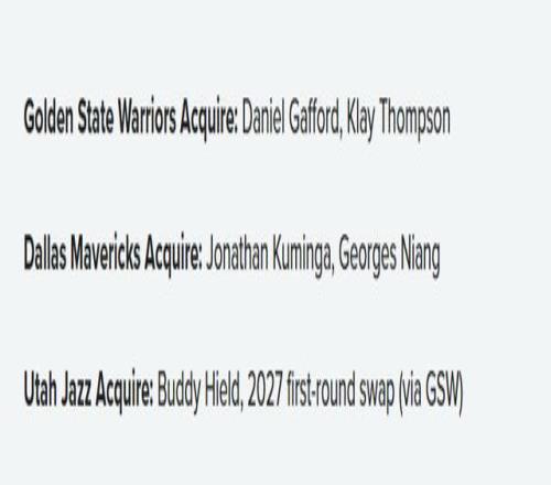 队记Slater透露,若有合适的球星可供交易,勇士“愿意送出多个首轮签”。如今字母哥和浓眉看似都已退出交易市场,小波特或许是最接近“球星标准”的选择。 小波特正处于生涯最佳赛季,场均砍下25.7分,三分命中率达到40.1%。他生涯早期饱受诟病的伤病隐患,也早已不复存在——自2023-24赛季至今,他仅缺席了13场比赛。他的投篮能力、新开发的自主进攻手段,以及身高体型,都能为勇士补齐球队缺失的短板;更何况,小波特早已证明过自己,能为总冠军球队贡献顶级战力,这一点无疑是加分项。 对于这支只要库里下场,进攻就频频崩盘的勇士来说,本赛季状态火热的小波特,绝对是雪中送炭。 篮网或许会希望拉第三方球队入局,或是向勇士索要更多选秀补偿,但他们也需谨防贪心不足。小波特的交易价值正处于生涯巅峰,篮网未必愿意冒险等待。一旦小波特遭遇伤病或缺阵,或是进攻状态下滑,勇士恐怕就不会拿出我们上述的这份报价了。要知道,就在几个月前,掘金为了送走他的合同,还不得不搭上一个选秀权。 若是拖到休赛期,小波特就会正式成为“租将”——他的合同将在下赛季结束后到期。 这笔交易,对双方来说都有促成的动力。 方案二:克莱-汤普森荣归故里 勇士得到:丹尼尔-加福德、克莱-汤普森 独行侠得到:乔纳森-库明加、乔治斯-尼昂 爵士得到:巴迪-希尔德、勇士2027年首轮签互换权