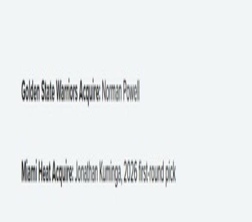 这是一笔情怀至上的交易:勇士迎回汤普森,同时还得到了球队多年来最具运动能力的内线球员。加福德近期饱受伤病困扰,但在2021-22至2023-24赛季,他每个赛季都至少出战72场。他的空接终结和护筐能力,能完美适配勇士任何一套不含格林(同样不擅长外线投射)的阵容。 汤普森下赛季的薪资为1750万美元,其赛场表现早已配不上这份薪水,但将他迎回阵中,为这套王朝核心可能的最后一搏(2026-27赛季)助力,这份吸引力毋庸置疑。库里、格林和汤普森的合同,都将在下赛季结束后到期。 独行侠则迎来了阵容年轻化,库明加的加盟,再加上尼昂的到期合同,也让球队薪资空间更具灵活性。鉴于受伤的浓眉大概率不会与球队续约,达拉斯着手围绕弗拉格搭建阵容,也合乎情理。23岁的库明加下赛季拥有球队选项,恰好契合这一建队时间线。 犹他爵士则扮演“第三方促成者”的角色,接手希尔德,并获得勇士2027年首轮签互换权,作为此次交易的回报。这笔交易的潜在阻碍,或许是爵士对勇士首轮签的估值——毕竟两年后的这支勇士,选秀顺位未必会比爵士自己的更高。但反过来想,勇士已是公认的王朝落幕,而爵士正处于上升期。希尔德2026-27赛季的薪资中,仅有300万美元受保障,再加上首轮签互换权的潜在价值,这些筹码足以勾起爵士的兴趣。 方案三:勇士阵容“再添一把年纪” 勇士得到:诺曼-鲍威尔 热火得到:乔纳森-库明加、2026年首轮签