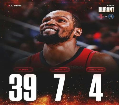 火箭110-105森林狼,战绩反超湖人升至西部第五。 此役背靠背出战的杜兰特亮相40分钟,投篮18中11(三分8中6)高效砍下39分4板7助2断1帽。 KD同样已经37岁,可在休斯顿照样逃脱不了被当驴使的命运。