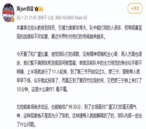 显然,外部的人已经看懂了,北控队内出问题了,至于说什么问题,笔者猜测,大概率就是主教练控制不住更衣室了,成绩不理想,难以服众了。