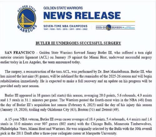 手术由伯特-曼德尔鲍姆医生主刀,对撕裂的ACL进行了重建。巴特勒已缺席过去9场比赛,将缺席2025-26赛季剩余所有比赛,并立即开始康复治疗。预计他将完全康复,下赛季初会提供最新恢复进展。 本赛季,巴特勒出战38场比赛(全部首发),场均在31.1分钟内得到20.0分、5.6个篮板、4.9次助攻和1.5次抢断。自上赛季(2025年2月7日)被勇士队交易得到,至本赛季受伤当日(2026年1月20日),勇士队以48胜的战绩位列NBA同期第四,仅落后于俄克拉荷马城雷霆(63胜)、波士顿凯尔特人(51胜)和底特律活塞(49胜)。 作为一名15年NBA老将,巴特勒职业生涯共出战907场比赛(802场首发),场均在33.0分钟内得到18.4分、5.4个篮板、4.4次助攻和1.6次抢断,曾效力于芝加哥公牛、明尼苏达森林狼、费城76人、迈阿密热火和金州勇士。他最初在2011年NBA选秀中被公牛队以第30顺位选中,此前在马奎特大学度过了三年大学生涯。 |