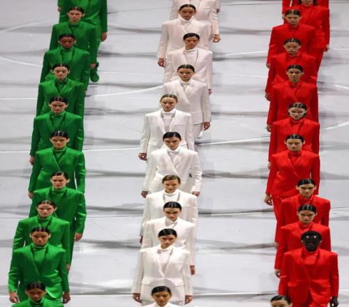 作为时尚之都,米兰更是把开幕式直接变成了T台。 东道主意大利队的队服,是乔治·阿玛尼亲自设计的,海军蓝、白、国旗绿,剪裁干净利落,高级感扑面而来。 模特身着意大利国旗颜色的服装走上赛场T台。