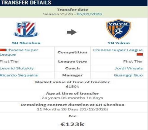 德转显示,费尔南多从上海申花加盟云南玉昆的转会费约100万人民币。
