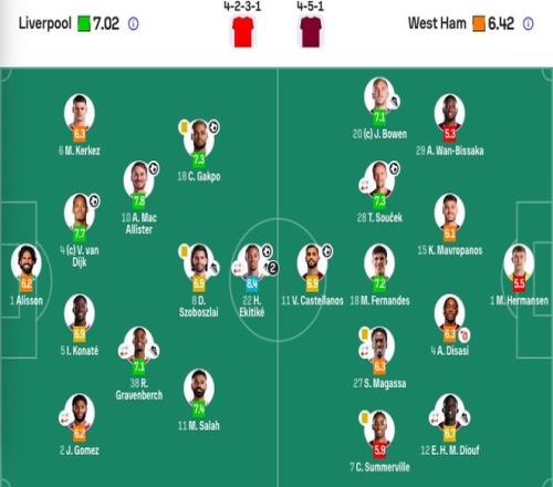 【出场阵容】 利物浦首发:1-阿利松、2-戈麦斯(76'30-弗林蓬)、4-范戴克、5-科纳特、6-凯尔凯兹、8-索博斯洛伊、10-麦卡利斯特、38-赫拉芬贝赫(85'42-尼奥尼)、11-萨拉赫、18-加克波、22-埃基蒂克(76'73-恩古莫哈) 替补未出场:25-马马尔达什维利、28-伍德曼、26-罗伯逊、47-卡尔文·拉姆塞、17-琼斯、14-基耶萨 西汉姆首发:1-赫尔曼森、4-迪萨西、15-马夫罗帕诺斯、29-万-比萨卡、12-迪乌夫(9063-梅耶斯)、27-马加萨(76'17-特劳雷)、28-绍切克(90'55-坎特)、18-马特乌斯·费尔南德斯、7-萨默维尔、11-卡斯特拉诺斯、20-鲍文 替补未出场:23-阿雷奥拉、2-沃克-彼得斯、3-基尔曼、25-托迪博、30-斯卡尔斯、9-卡勒姆·威尔逊 |