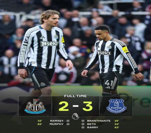 纽卡斯尔联2-3埃弗顿 相比之下,纽卡斯尔联的夜晚则显得苦涩。主场迎战埃弗顿,纽卡两度扳平,却在最后时刻再度失守,2-3告负。