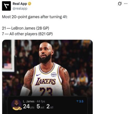 凭借这样的表现,詹姆斯在41岁之后出战28场比赛就已经21次单场交出20+得分表现再度刷新NBA历史纪录。 并且处于断档领先状态,联盟历史上其他球员在41岁后一共打了621场比赛仅7次拿到20+。 同时本场送出5次助攻后,詹姆斯湖人生涯助攻数来到3669次,超越迈克尔-库珀升至队史第五。