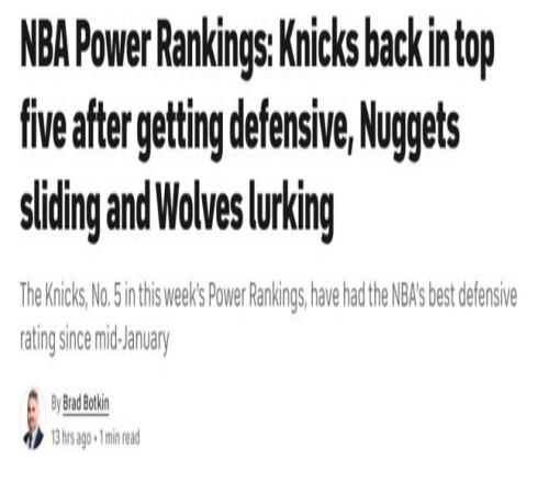 11-15名:湖人(10)、猛龙(11)、太阳(15)、魔术(14)、76人(12) 在全明星后遭遇数场尴尬的失利,过去一周湖人趁着战绩难度下滑强势反弹,詹姆斯与东契奇也用傲人表现打破内部不和流言,之所以排名下滑一位主要是因为黄蜂的异军突起。