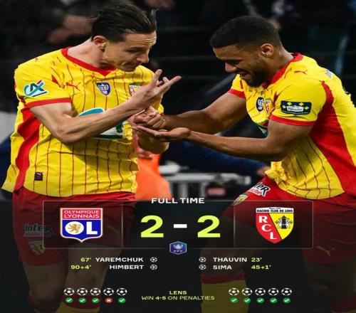 常规时间结束,双方战成平局,比赛不得不进入残酷的点球大战。前三轮双方全部命中,比分始终胶着。但在第四轮,里昂后卫尼亚凯特的点球被门将神勇扑出,而朗斯的桑加雷则稳稳罚进,局势瞬间逆转。 最后一轮,恩德里克顶住压力罚入,但托万同样稳稳命中。最终朗斯在点球大战中5-4获胜,总比分7-6淘汰里昂,成功晋级法国杯四强。