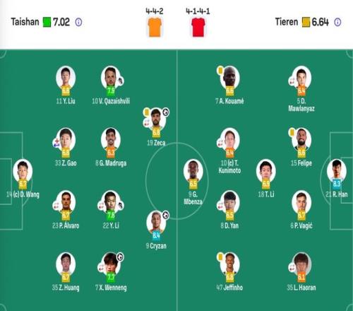 【出场阵容】 山东泰山首发(3-4-3) 门将:14-王大雷 后卫:35-黄政宇、23-佩德罗·阿尔瓦罗(F)(81'5-郑铮)、33-高准翼(66'3-彭啸) 中场:7-谢文能(87'6-王彤)、8-马德鲁加(F)、22-李源一(87'37-陈泽仕)、11-刘洋 前锋:9-克雷桑(F)、19-泽卡(F)(81'29-陈蒲)、10-卡扎伊什维利(F) 替补未出场:1-于金永、36-刘骐玮、20-德尔加多、21-刘彬彬、24-段刘愚、17-李小恒、42-彭逸翔 辽宁铁人首发(4-1-4-1) 门将:21-韩镕泽 后卫:5-迪力穆拉提(65'27-高嘉润)、6-瓦吉奇(F)、15-费利佩(F)(46'26-元敏诚)、35-李浩然 后腰:18-李提香 中前卫:7-安以恩、8-严鼎皓(78'11-陈彬彬)、10-邦本宜裕(F)(46'28-许东)、47-热菲尼奥(F) 前锋:9-姆本扎(F) 替补未出场:1-库迪热提、3-潘喜明、4-田子羿、33-田依浓、36-田德澳、14-臧一锋、17-田玉达、20-桂子涵 主裁:张雷 VAR:甄伟 |