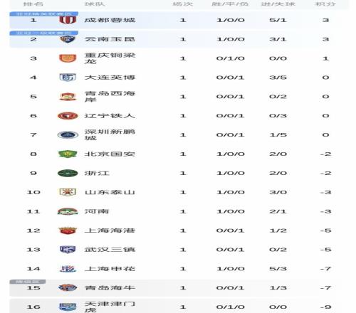 随着国安20完胜三镇,中超首轮收官!最新积分榜:泰山跌至第10