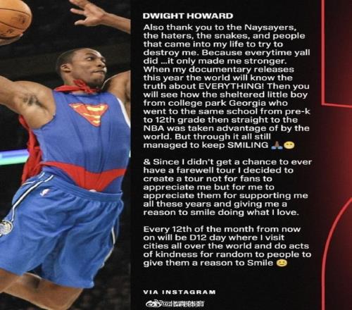 超人披风一度是霍华德的鲜明标签之一。在2008年全明星扣篮大赛时,正值巅峰时期、当时效力于魔术的霍华德,身披红色披风出战扣篮大赛,成为NBA的经典瞬间。 霍华德的职业生涯有无数荣誉,2004年状元秀、一次总冠军(虽然在湖人只是角色球员)、3次最佳防守球员(在魔术巅峰时期)、2008年北京奥运会冠军成员等等,但他却落选NBA75大巨星,这无疑是一大遗憾。霍华德在退役长文中表示,接下来他将策划一次全球巡演,以回馈一直以来热爱与支持他的球迷。 异常出色的身体天赋,让霍华德在2004年选秀大会上毫无争议地当选状元。在那个时代,中锋很吃香。霍华德还未进入联盟,就被看作是“下一个奥尼尔”。霍华德在很长一段时期都通过比赛表现去兑现天赋,满足外界预期。