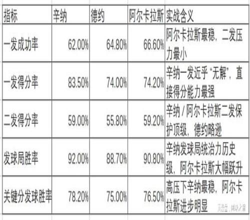 通过以上指标,我们在AI的辅助下可以分析出三位球员的发球特点。 1. 辛纳:“精密重炮型” 发球 核心优势:一发得分率 + 发球局胜率双第一,单拍质量均衡无短板,关键分统治力最强。 打法适配:底线稳定 + 发球压制,几乎不给对手接发机会,是 “发球 + 底线” 的完美模板。 数据结论:TDI 发球体系下的天花板级表现,过去 52 周发球效率历史级。 2. 德约:“精准控制型” 发球 核心优势:一发成功率 + 落点变化顶级,低失误 + 高稳定性,38 岁仍保持顶级水准。 打法适配:发球为相持铺垫,通过精准落点调动对手,为接发与多拍相持创造优势。 数据结论:传统发球大师的极致稳定版,TDI 评分体现其 “控制为王” 的核心逻辑。 3. 阿尔卡拉斯:“暴力进化型” 发球 核心优势:一发成功率 + 二发得分率大幅提升,过去 52 周发球全面进化,爆发力与稳定性兼顾。 打法适配:发球为进攻发起点,二发侧旋 + 高弹跳压制接发,衔接正手暴力进攻。 数据结论:新生代发球天花板,TDI 评分反映其 “从弱到强” 的技术升级路径。