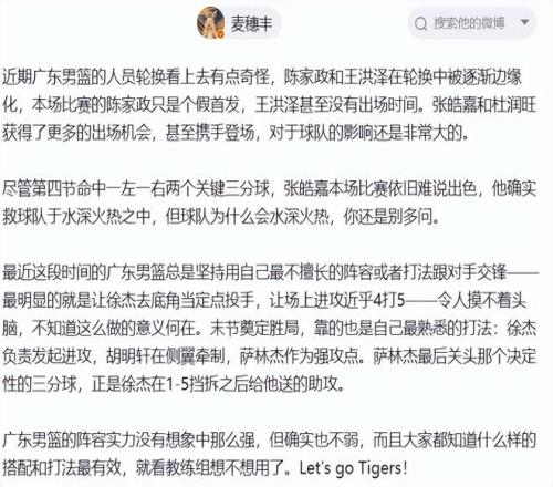 赛后,媒体人“麦穗丰”发文替陈家政、王洪泽打抱不平,并质疑杜锋:陈家政和王洪泽在轮换中被逐渐边缘化,本场比赛的陈家政只是个假首发,王洪泽甚至没有出场时间。张皓嘉和杜润旺获得了更多的出场机会,甚至携手登场,对于球队的影响还是非常大的。最近这段时间的广东男篮总是坚持用自己最不擅长的阵容或者打法跟对手交锋——最明显的就是让徐杰去底角当定点投手,让场上进攻近乎4打5——令人摸不着头脑,不知道这么做的意义何在。