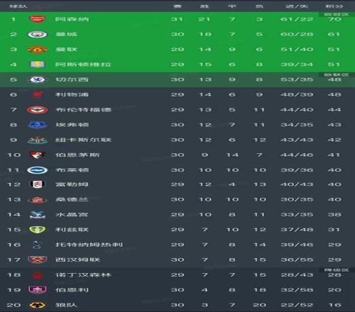 随着阿森纳20、曼城11,英超最新排名出炉!切尔西排第5