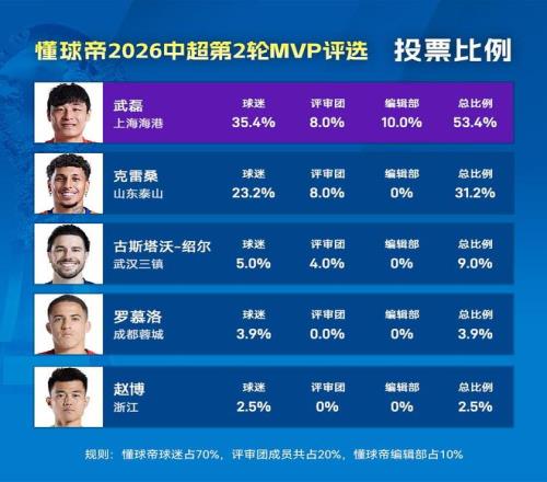 大家好,欢迎来到懂球帝2026赛季中超MVP的评选现场。在本赛季的第2轮MVP评选中,伤愈复出的“武球王”以53.4%的高得票率成功当选本轮MVP,这也是武磊第22次当选懂球帝MVP。