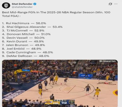 自2010年以来,雷霆13次打进季后赛,同期联盟第二多,仅次于凯尔特人的15次。雷霆二当家杰伦-威廉姆斯因伤继续休战,亚历山大出战35分钟,投篮27中14,三分5中3,罚球11中9,狂砍40分5篮板2助攻4抢断,正负值-4。 亚历山大连续129场砍下20+,继续刷新自己创造的NBA历史纪录。以雷霆的战绩还有亚历山大的数据,他要蝉联常规赛MVP了。再看一组数据,本赛季中距离跳投命中率,亚历山大53.4%排名联盟第二,仅次于八村塁(56%)。