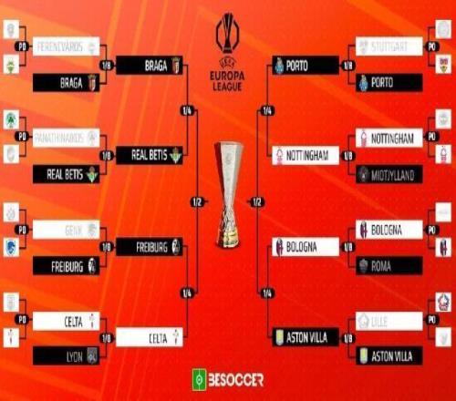●欧联杯1/8决赛总比分 (队名列前者先主后客) 费伦茨城2比4布拉加(2比0、0比4) 帕纳辛奈科斯1比4贝蒂斯(1比0、0比4) 亨克2比5弗赖堡(1比0、1比5) 塞尔塔3比1里昂(1比1、2比0) 斯图加特1比4波尔图(1比2、0比2) 诺丁汉森林2比2(点3比0)中日德兰(0比1、加时2比1) 博洛尼亚5比4罗马(1比1、加时4比3) 里尔0比3阿斯顿维拉(0比1、0比2) ●欧联杯1/4决赛对阵 (队名列前者先主后客) ①布拉加vs贝蒂斯 ②弗赖堡vs塞尔塔 ③波尔图vs诺丁汉森林 ④博洛尼亚vs阿斯顿维拉 两回合比赛将于4月9日、16日进行。 ●欧联杯半决赛对阵 (队名列前者先主后客) ①胜者vs②胜者 ③胜者vs④胜者 两回合比赛将于4月30日、5月7日进行。 ●欧联杯夺冠赔率 阿斯顿维拉:2.75 波尔图:5 贝蒂斯:6.5 博洛尼亚:10 诺丁汉森林:11 塞尔塔:11 弗赖堡:15 布拉加:21