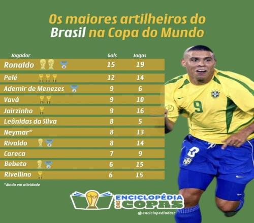 最近TNT体育整理了巴西队世界杯历史射手榜,罗纳尔多15球排在第一,贝利12球排在第二,内马尔8球也已经排在了前列。巴西队世界杯历史上的顶级射手,几乎都在这张榜单里。可名单摆出来之后,很多人第一反应可能不是罗纳尔多第一,而是内马尔只排在这个位置? 罗纳尔多 | Ronaldo进球:15 出场:19 场均进球:0.79 世界杯届数:4届(1994、1998、2002、2006)