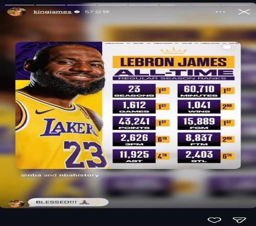 詹姆斯社媒转发自己职业生涯多项历史纪录:心怀感恩