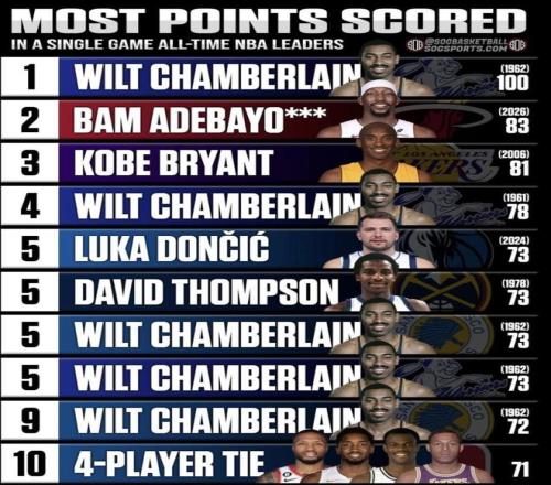 单场得分最多NBA历史单场得分榜 张伯伦 | Wilt CHAMBERLAIN 位置:中锋 当时年龄:25岁 100分(1962) 阿德巴约 | Bam ADEBAYO 位置:中锋 / 大前锋 当时年龄:28岁 83分(2026) 科比 | Kobe BRYANT 位置:得分后卫 当时年龄:27岁 81分(2006) 张伯伦 | Wilt CHAMBERLAIN 位置:中锋 当时年龄:25岁 78分(1961) 东契奇 | Luka DONČIĆ 位置:控球后卫 / 得分后卫 当时年龄:24岁 73分(2024) 汤普森 | David THOMPSON 位置:得分后卫 当时年龄:23岁 73分(1978) 张伯伦 | Wilt CHAMBERLAIN 位置:中锋 当时年龄:25岁 73分(1962) 张伯伦 | Wilt CHAMBERLAIN 位置:中锋 当时年龄:26岁 73分(1962) 张伯伦 | Wilt CHAMBERLAIN 位置:中锋 当时年龄:26岁 72分(1962) 4人并列——71分 利拉德 | Damian LILLARD 位置:控球后卫 当时年龄:32岁 米切尔 | Donovan MITCHELL 位置:得分后卫 当时年龄:26岁 罗宾逊 | David ROBINSON 位置:中锋 当时年龄:28岁 贝勒 | Elgin BAYLOR 位置:小前锋 当时年龄:26岁