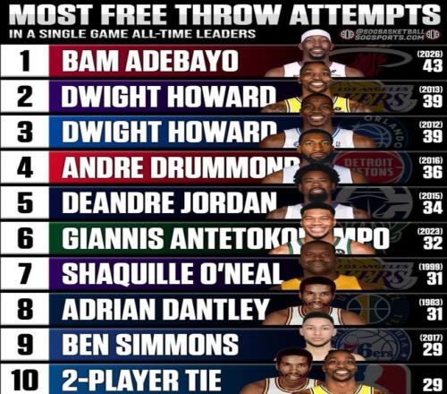 NBA历史单场罚球出手榜阿德巴约 | Bam ADEBAYO 位置:中锋 / 大前锋 当时年龄:28岁 43次(2026) 霍华德 | Dwight HOWARD 位置:中锋 / 大前锋 当时年龄:27岁 39次(2013) 霍华德 | Dwight HOWARD 位置:中锋 / 大前锋 当时年龄:26岁 39次(2012) 德拉蒙德 | Andre DRUMMOND 位置:中锋 当时年龄:22岁 36次(2016) 小乔丹 | DeAndre JORDAN 位置:中锋 当时年龄:26岁 34次(2015) 阿德托昆博 | Giannis ANTETOKOUNMPO 位置:大前锋 当时年龄:29岁 32次(2023) 奥尼尔 | Shaquille O'NEAL 位置:中锋 当时年龄:27岁 31次(1999) 丹特利 | Adrian DANTLEY 位置:小前锋 当时年龄:28岁 31次(1983) 西蒙斯 | Ben SIMMONS 位置:控球后卫 / 大前锋 当时年龄:21岁 29次(2017) 2人并列——29次 西蒙斯 | Ben SIMMONS 位置:控球后卫 / 大前锋 当时年龄:21岁 丹特利 | Adrian DANTLEY 位置:小前锋 当时年龄:28岁