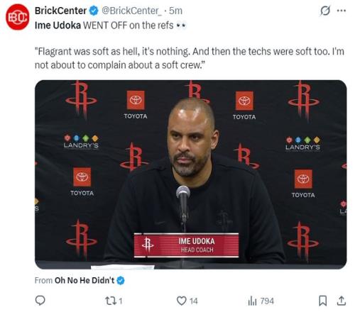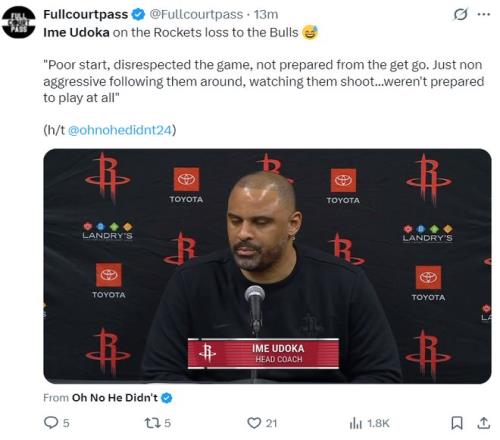 乌度卡炮轰裁判是软蛋!休媒高呼输球不怪他火箭角色球员28中10